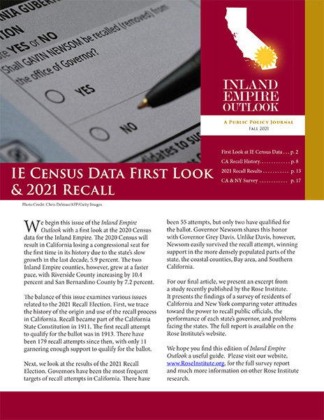 The Rose Institute has long maintained a regional focus on Southern California’s Inland Empire (usually defined as Riverside and San Bernardino Counties). The region is home to more than 4.6 million residents, making it the nation’s 12th largest Metropolitan Statistical Area (MSA) by population. Although Claremont is located in neighboring Los Angeles County, it is often considered part of the western edge of the Inland Empire and is proximate to the region’s largest population centers.